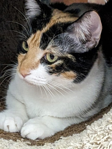 Mona the 4th calico sister, adopted to a couple who had a singleton boy cat who needed a friend. Living in Riverside now